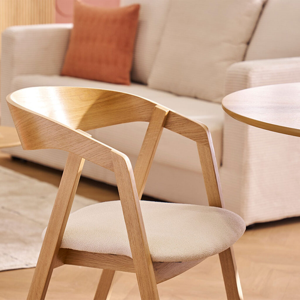 « Il est important de prendre en compte les éléments autour. Notamment le sol et la table. » Emmanuelle nous propose alors 2 options selon vos goûts. Soit on fait un total look, c’est-à-dire exactement la même matière et le même design que votre table ou votre sol. Soit on choisit de mixer. Par exemple, des chaises en métal avec une table en bois, des chaises en tissu avec une table en métal, etc.